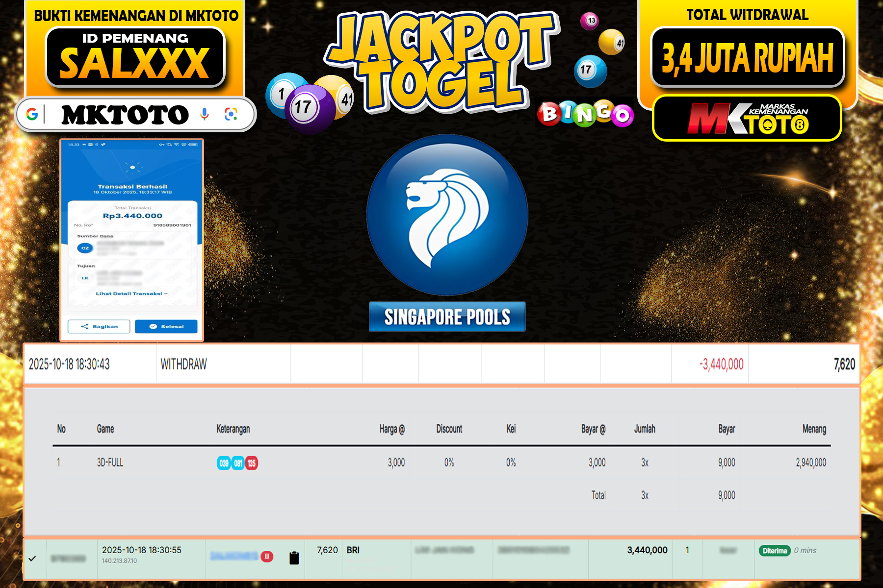JACKPOT SINGAPORE POOLS DENGAN TOTAL HADIAH 3,4 JT RUPIAH !!