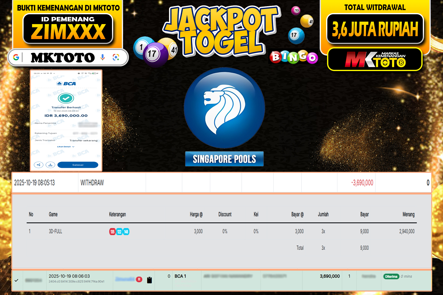 JACKPOT SINGAPORE POOLS DENGAN TOTAL HADIAH 3,6 JT RUPIAH !!