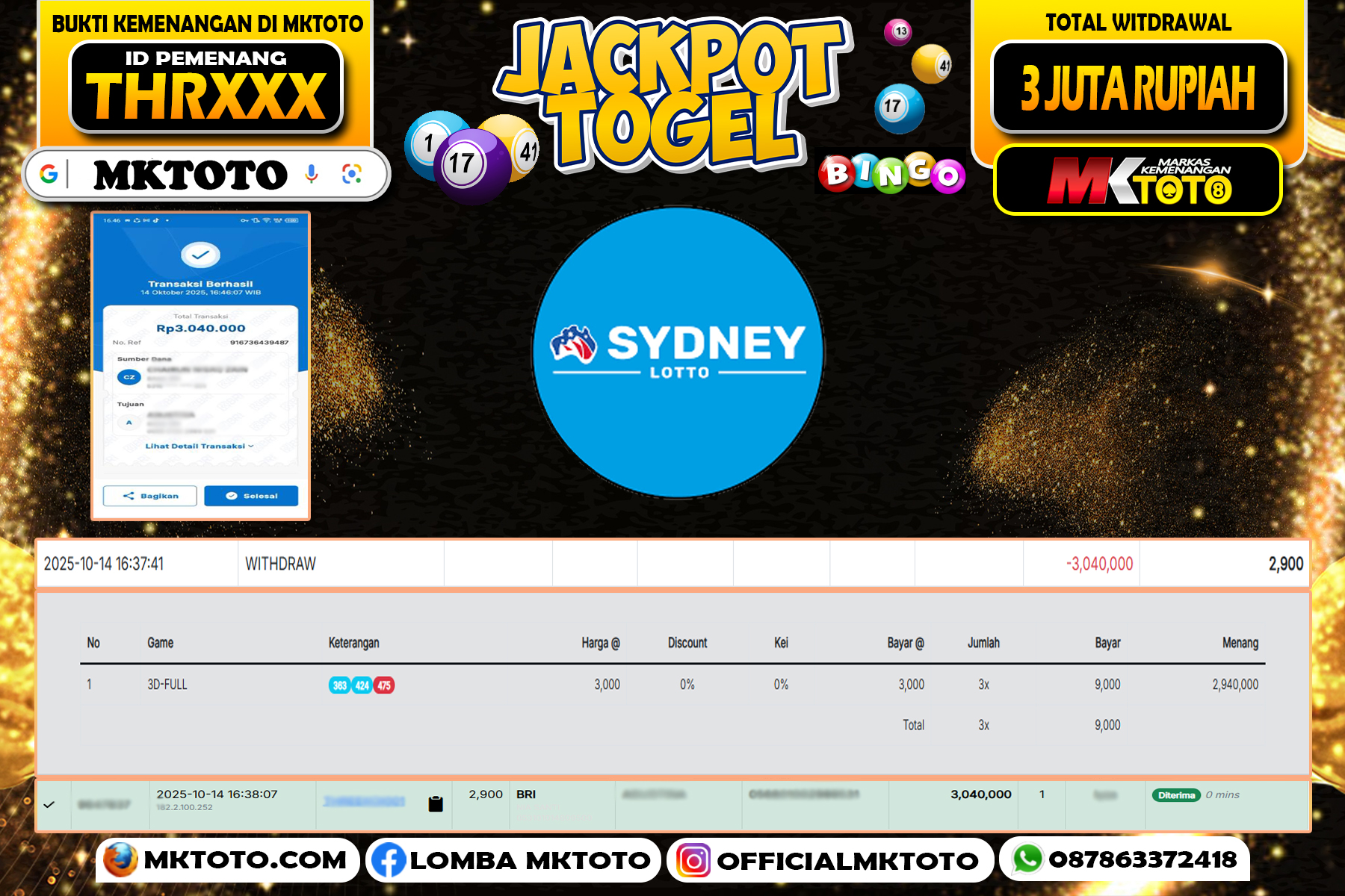 JACKPOT SYDNEY LOTTO DENGAN TOTAL HADIAH 3 JT RUPIAH !!