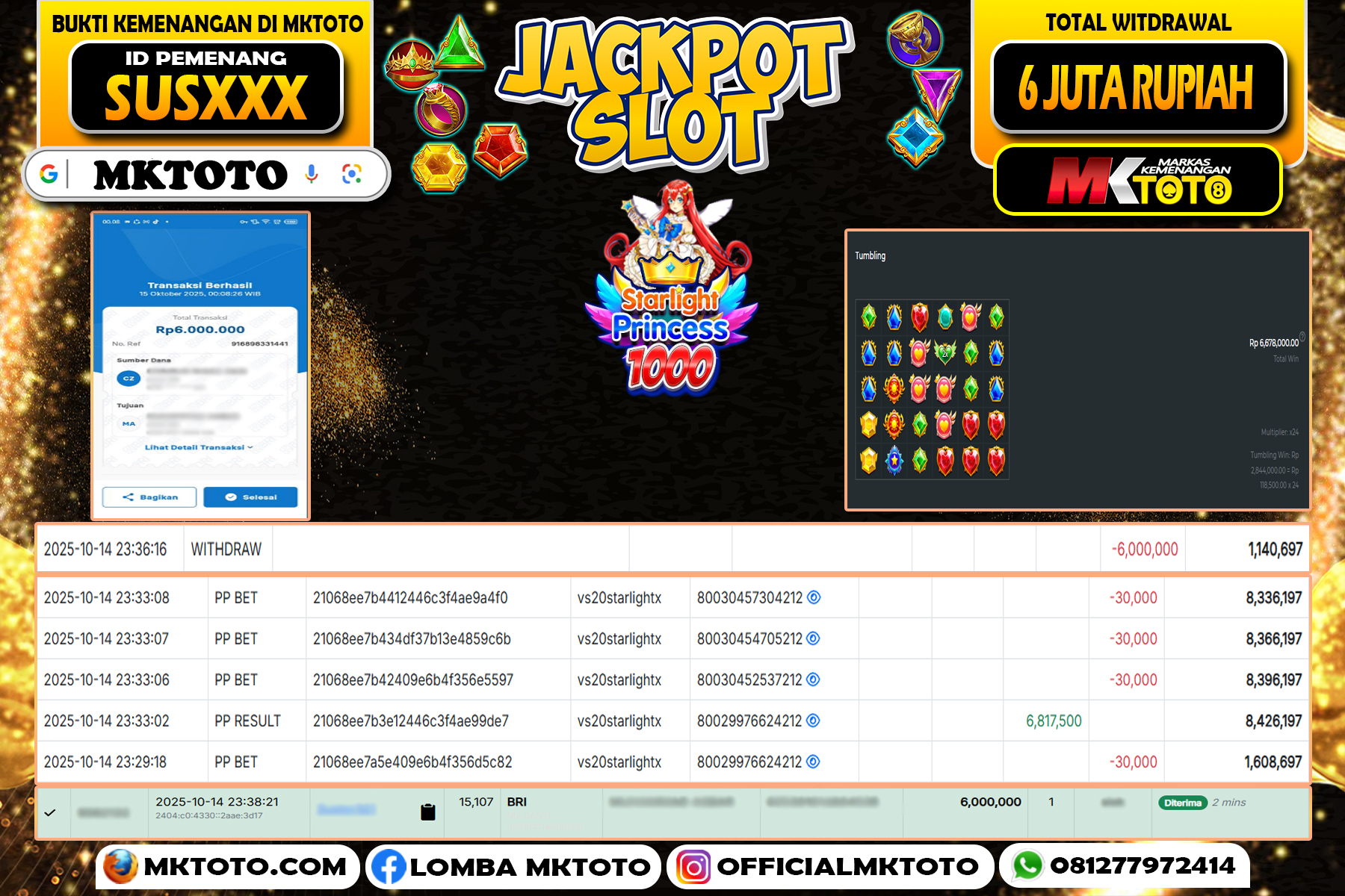 JACKPOT STARLIGHT PRINCESS 1000 DENGAN TOTAL HADIAH 6 JT RUPIAH !!